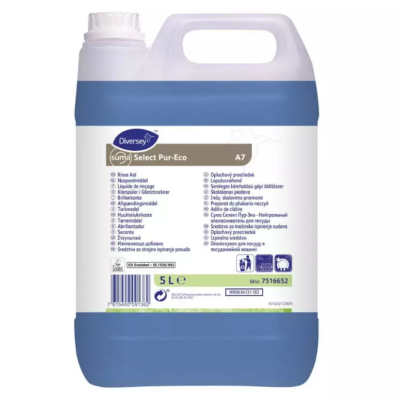 Suma Select Pur-Eco A7 on tiivistetty, laimennoksessa neutraali huuhtelukirkaste, joka soveltuu kaikentyyppisiin astianpesukoneisiin. Tuote sisältää ionittomia pinta-aktiivisia aineita, jotka alentavat loppuhuuhteluveden pintajännitystä, mikä estää pisaranjälkien muodostumisen, ja koska vesi valuu astioiden pinnoilta ohuena kalvona, kuivumisaika lyhenee.