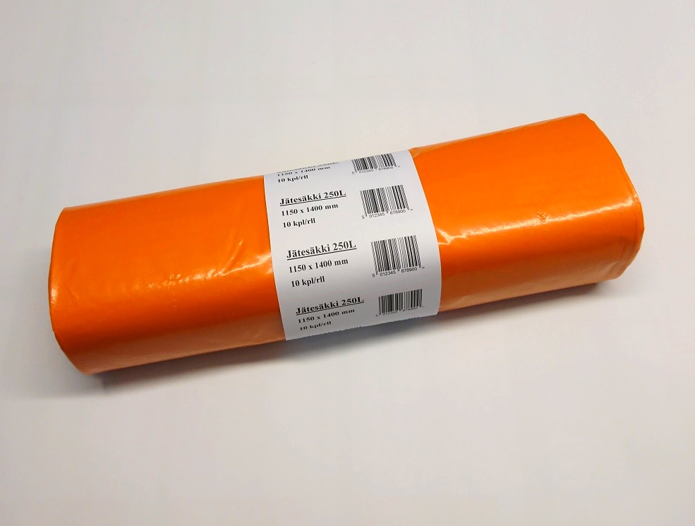 JÄTESÄKKI 250 L Vahva jätesäkki jätteiden lajitteluun. Materiaali: LD-PE. Mitat: 1150 x 1400 mm. Tuote myydään rullittain. 10 kpl/rll, 8 rll/ltk, 40 ltk/lava. Väri: oranssi.... Lue lisää