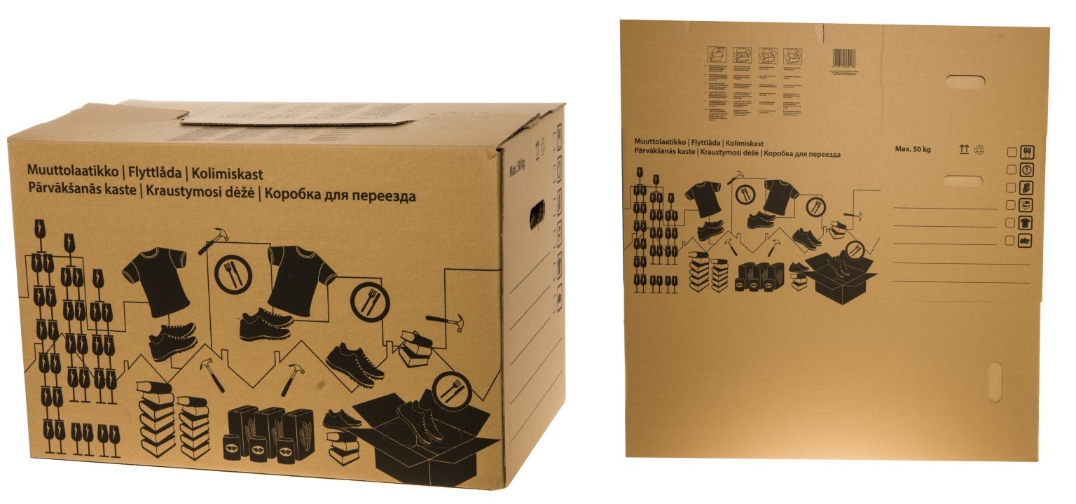 Muuttolaatikko 58 x 38 x 38 cm. Ruskea. Kantoaukot. Paksuus 3mm, kartonki B-aalto. Max. kuorma 40kg. Hakusanat: pahvilaatikko