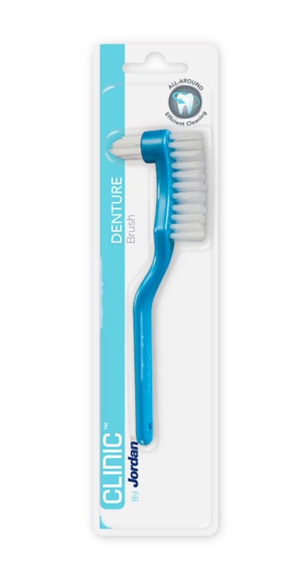 Jordan Clinic Denture Brush -proteesiharjassa on kaksi päätä, jotka takaavat tehokkaamman puhdistuksen. Isompi pää sopii suurempien alueiden puhdistukseen. Pienempi pää poistaa tehokkaasti plakkia hankalammista paikoista, esim. hammasväleistä. Tukeva varsi helpottaa tuotteen käyttöä erityisesti henkilöillä, joilla on heikentynyt motoriikka. Hammasproteesin pesu mekaanisesti sekä kemiallisesti on erittäin tärkeää. Huolellinen proteesin puhdistus estää plakin syntymisen sekä sienitulehdukset.