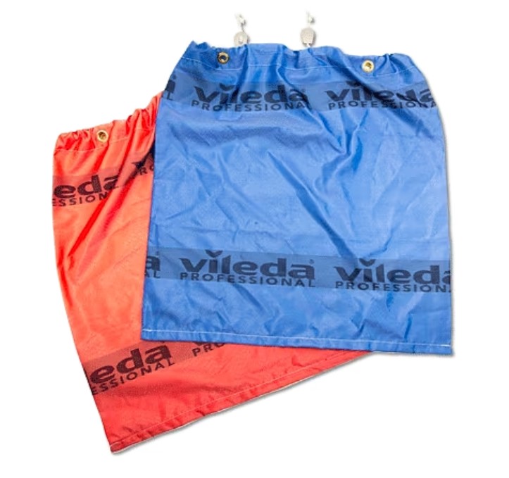 1 kpl punaisia Vileda-pyykkisäkkejä siivouspyykin lajitteluun siivousvaunussa.