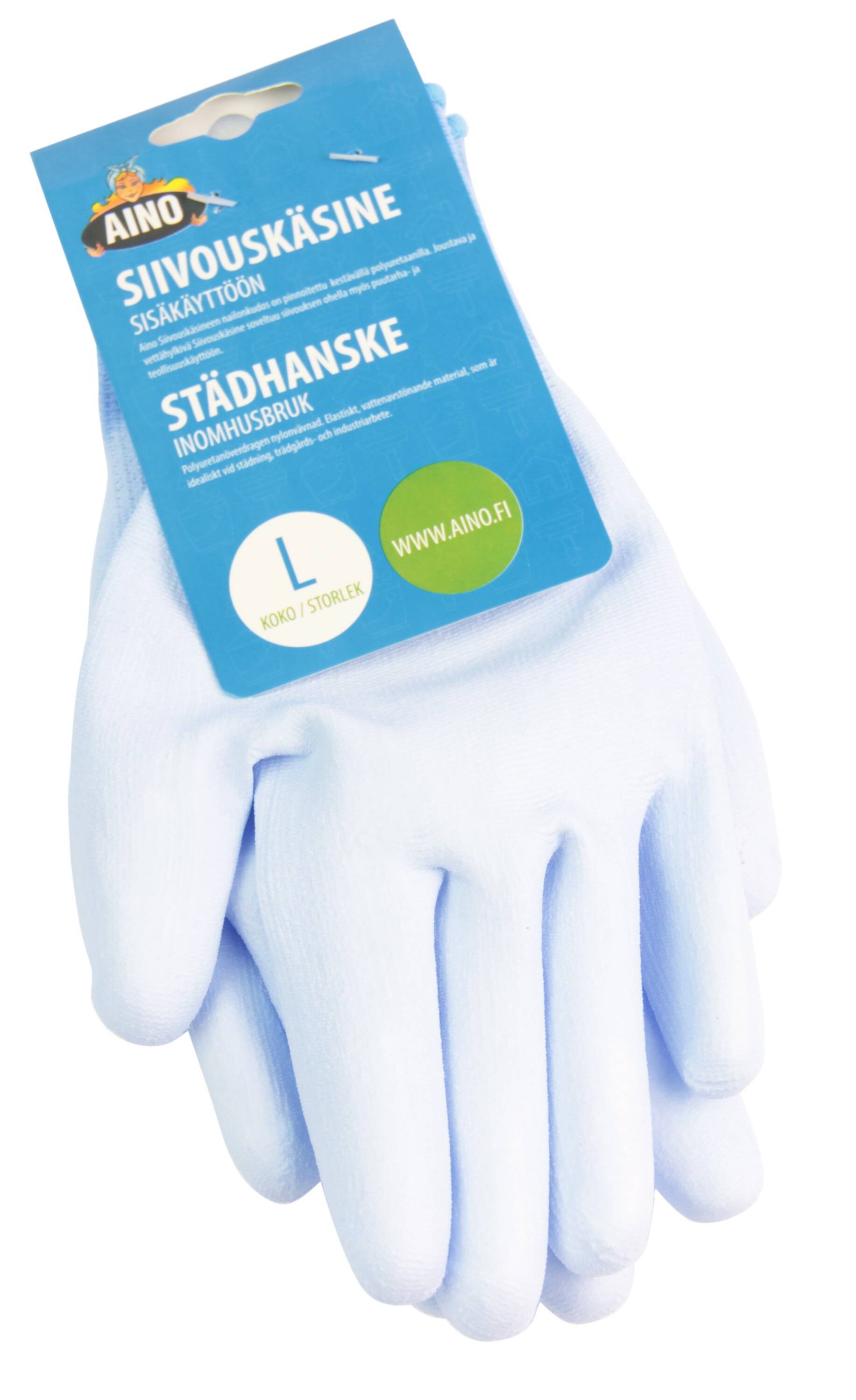 AINO Siivouskäsine Aino siivouskäsine on suunniteltu siivoojan apuriksi käsiä suojaamaan. Käsineen nailonkudos on pinnoitettu kestävällä polyuretaanilla. Joustaja ja vettähylkivä... Lue lisää