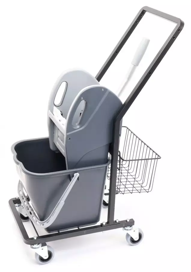 Kätevä pieni moppikärry, jossa on helposti rullaavat pyörät. Moppikärryn rungossa on reikiä, joihin voi kiinnittää lisävarusteena saatavia telineitä ja muita tarvikkeita.