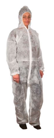 - Valkoinen kertakäyttöinen suojahaalari hupulla ja vetoketjulla.