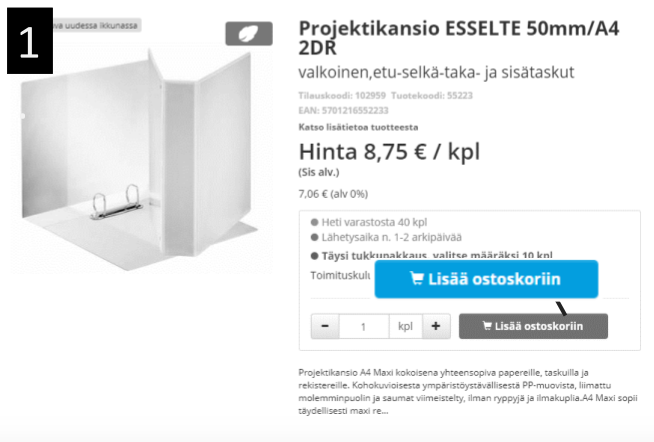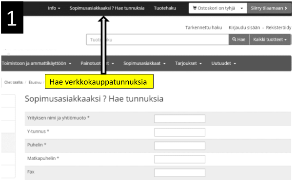 Ostaminen verkkokaupastamme on helppoa ja nopeaa. Voit tilata ilman tunnuksia, mutta yritysasiakkaiden on mahdollista hakea itselleen tunnuksia, jotka helpottavat tilaamista. Verkkokauppatunnusta voi hakea yläpalkista olevasta linkistä (kuva 1). Sopimusasiakkaat voi tilata tuotteet laskulla ja yhteystiedot tallentuvat automaattisesti tietojärjestelmäämme, jolloin niitä ei joka tilauksen yhteydessä tarvitse kirjoittaa uudelleen.