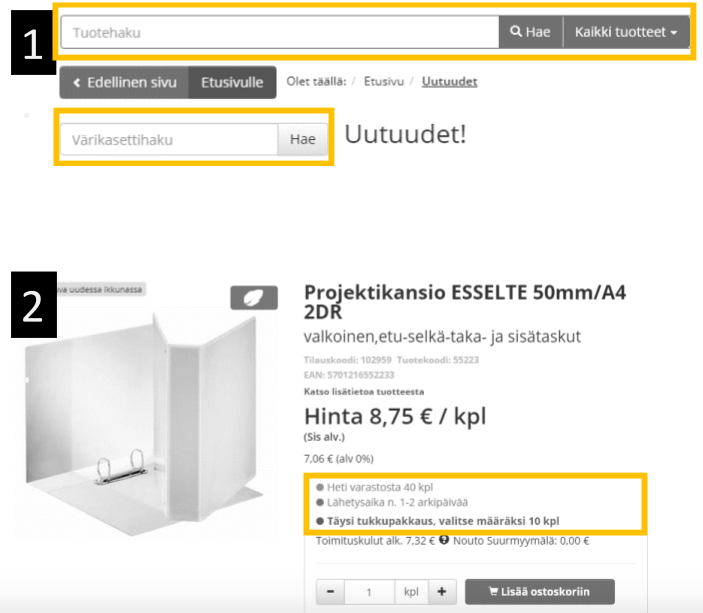 Voit hakea tuotteita tuotehaun avulla. Tuotteita voi hakea nimellä, nimen osalla, koodilla, värillä (esim. mappi sininen), EAN- koodilla, tuotemerkillä ja näiden yhdistelmillä. Yleisesti ottaen paras ohje haussa on kirjoittaa hakukenttään mahdollisimman vähän jotta saa useampia osumia.