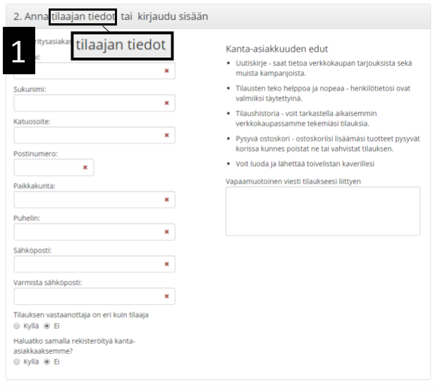 Kun olet kerännyt kaikki haluamasi tuotteet ostoskoriin, lisää maksajan tiedot ja tarvittaessa vastaanottajan tiedot (kuva 1), mikäli tilauksen vastaanottaja on eri kuin maksaja. Sopimusasiakkaille verkkokauppa antaa automaattisesti sovitut yhteystiedot. Tarkista että sähköpostiosoite ja puhelinnumero ovat oikeat.
