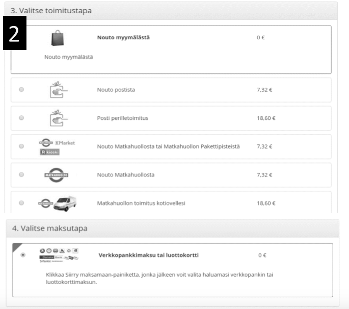Kun olet lisännyt tarvittavat tiedot, siirry valitsemaan toimitus- ja maksutapa, klikkaamalla kuvaketta tai ruksia (kuva 2). Sopimusasiakkaille on sovittu ehdot jo etukäteen, valitse sen mukaisesti tiedot. Toimituskulut näet toimitustavan yhteydessä. Kun olet tarkistanut että ostoskorissa on kaikki tarvittavat tuotteet ja olet syöttänyt oikeat tiedot kenttiin, klikkaa ”Siirry maksamaan” tai ”Lähetä tilaus”- painiketta.