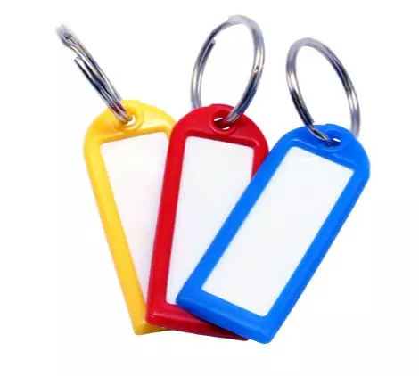 - tukeva muovinen, ikkunallinen avaimenperä, jossa paikka nimilapulle.