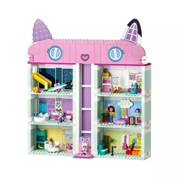Gabbyn nukketalossa on 8 värikästä huonetta, joiden välillä voi liikkua hissillä. Jokaisessa huoneessa on yllin kyllin kivaa puuhaa. Lapset voivat leipoa kakun keittiössä, leikkiä liukumäessä pelihuoneessa, antaa luovuuden loistaa askarteluhuoneessa, soittaa pianoa musahuoneessa, rentoutua kylpyhuoneessa, ottaa päiväunet makuuhuoneessa tai suunnata katolle ja tanssahdella pyörivällä tanssilattialla. Lasten seikkailuissa on mukana 4 TV-sarjasta tuttua hahmoa: Gabby, Pandi Pörrö, Hile ja Merikatti. Pakkaus sisältää kuvitetut, tarinaan perustuvat rakennusohjeet, ja LEGO Builder sovelluksesta löydät intuitiiviset zoomaus‑ ja kiertotyökalut. Ison aloituspalikan avulla hauskan rakentelun pariin pääsee heti.