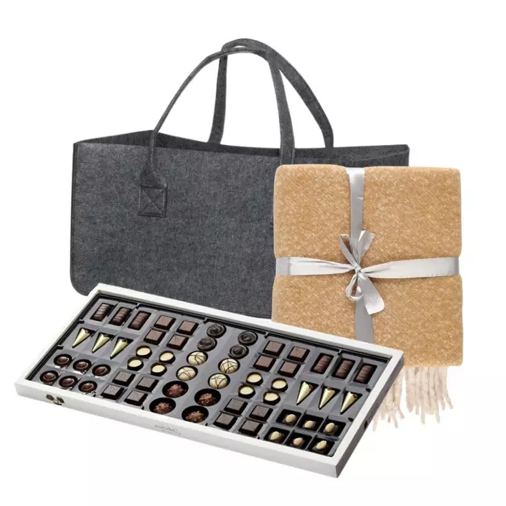 Pehmoinen torkkupeitto ja jättikokoinen suklaarasia pakattuna kauniiseen huopakassiin.