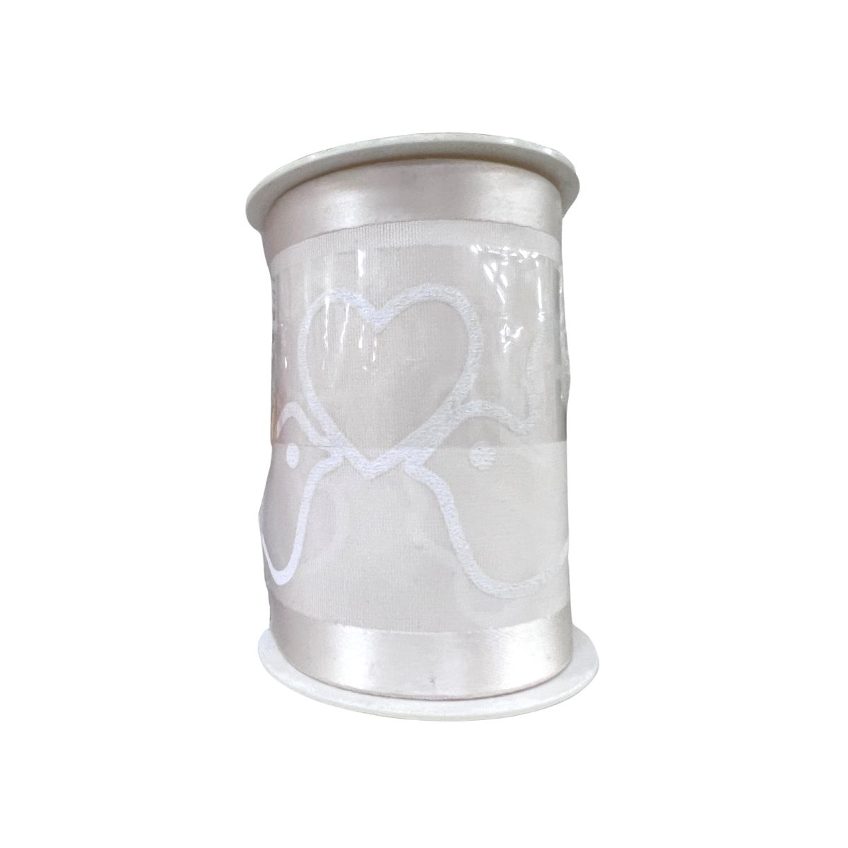 Vaalean beigen/shampanjan värinen koristenauha, jossa sydänten ja kyyhkysten kuvia.