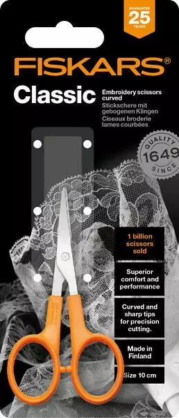Classic-saksien teräväkärkiset, kapeat ja kaarevat terät sopivat tarkkaan leikkaamiseen. Pienien terien ansiosta saksilla mahtuu leikkaamaan myös ompelukoneen paininjalan alta. Sakset soveltuvat myös kynsisaksiksi. Ikoninen oranssi kahva on iskunkestävä, helppo puhdistaa ja ergonomisesti muotoiltu.