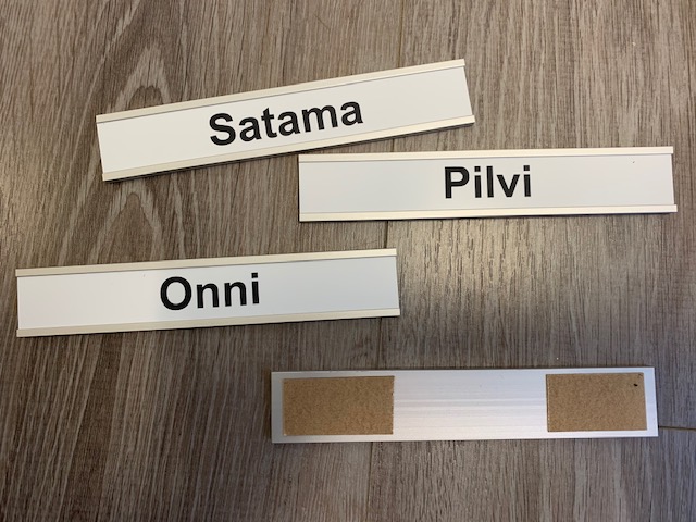 Hopean värinen alukisko 200x24mm 2-puol teippikiinnitys ja valkoisella tai mustalla levyllä jossa nimikointi. Myyntierä 4kpl Kerro tilatessasi vapaamuotoisessa tekstikohdassa kyltin taustaväri ja tekstit/ nimet jotka kyltteihin laitetaan.