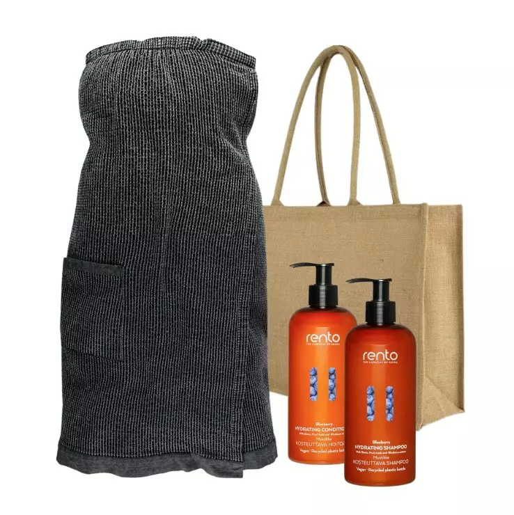 Kietaisupyyhe pehmoista puuvillasekoitetta sekä mustikantuoksuiset shampoo ja hoitoaine pakattuna jämäkkään juuttikassiin.