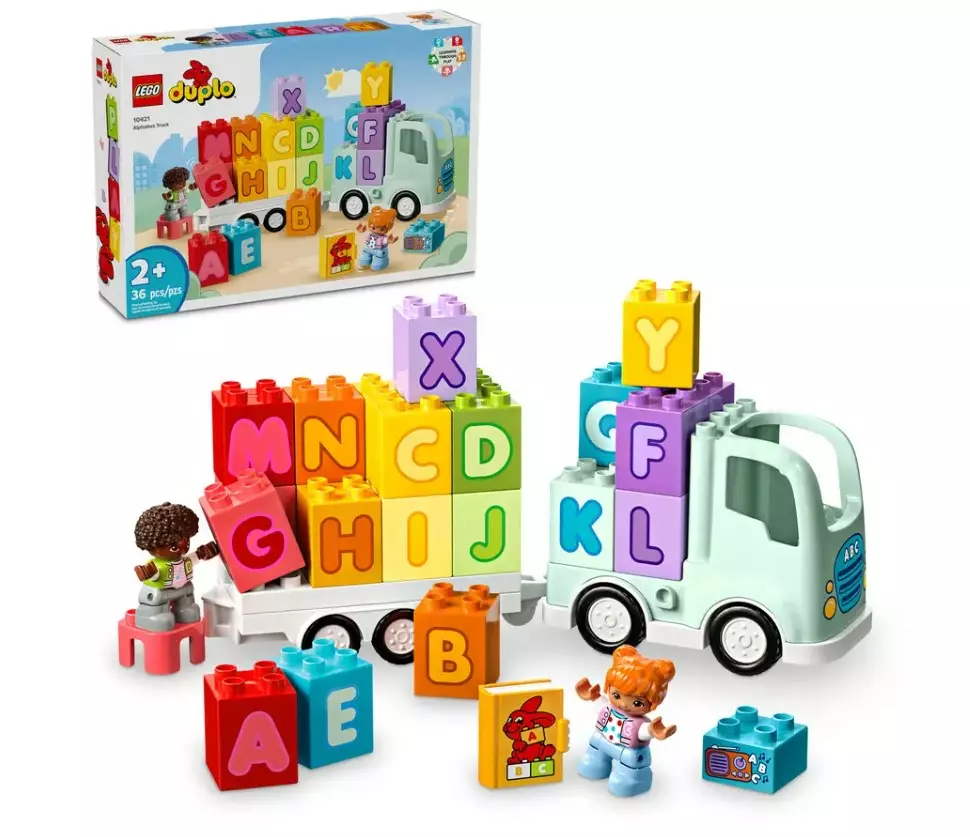Aakkosten opetteluun suunniteltu luova lelu innostaa oppimaan leikkien lomassa. Lapset kiinnittävät perävaunun rekkaan ja auttavat 2 LEGO DUPLO hahmoa lastaamaan palikoita kyytiin ja purkamaan niitä pois. Leikin lomassa opitaan kirjaimia ja värejä, ja samalla myös kielelliset ja hienomotoriset taidot kehittyvät.