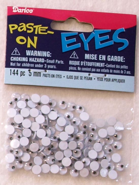 Liimattavat askartelusilmät. Valkoinen silmä mustalla pupililla.