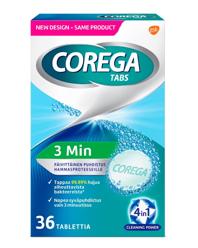 Corega 3 Minutes -puhdistustablettien äärimmäisen nopeasti toimiva koostumus tappaa 99,99 % pahanhajuista hengistystä aiheuttavista bakteereista* vain kolmessa minuutissa ja muita mikrobeja viidessä minuutissa käyttöohjeiden mukaan käytettynä. Lisäksi Corega 3 Minutes poistaa vaikeita värjäytymiä ja antaa raikkaan tunteen, jotta voit huoletta mennä lähelle sinulle tärkeitä ihmisiä. Hammasproteesin puhdistaminen Corega-puhdistustableteilla osana päivittäistä suuhygieniaa auttaa parantamaan suunterveyttä.