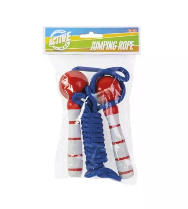 Yhden hengen hyppynaru sinisellä punotulla kangasnarulla ja punavalkoisilla puisilla kahvoilla.