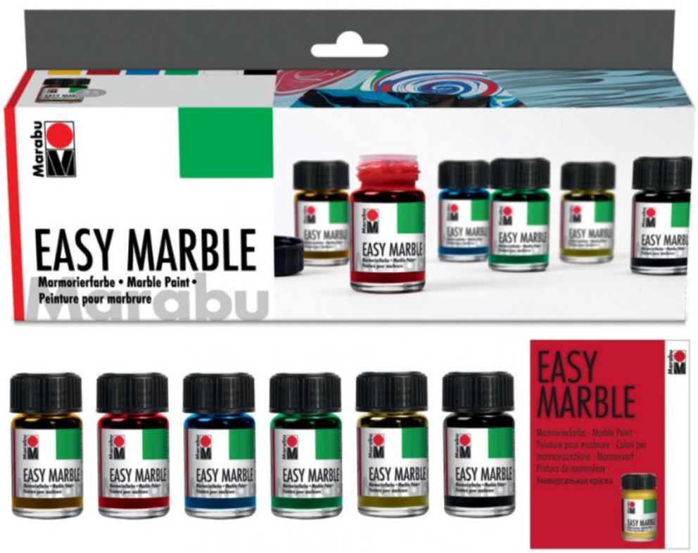 - Nopeasti kuivuva Easy Marble-marmorointivärisarja soveltuu etenkin kun dippaat marmoriväriin muovia, lasia, akryyliä, paperimassaa tai tyhjäksi puhallettuja munia.