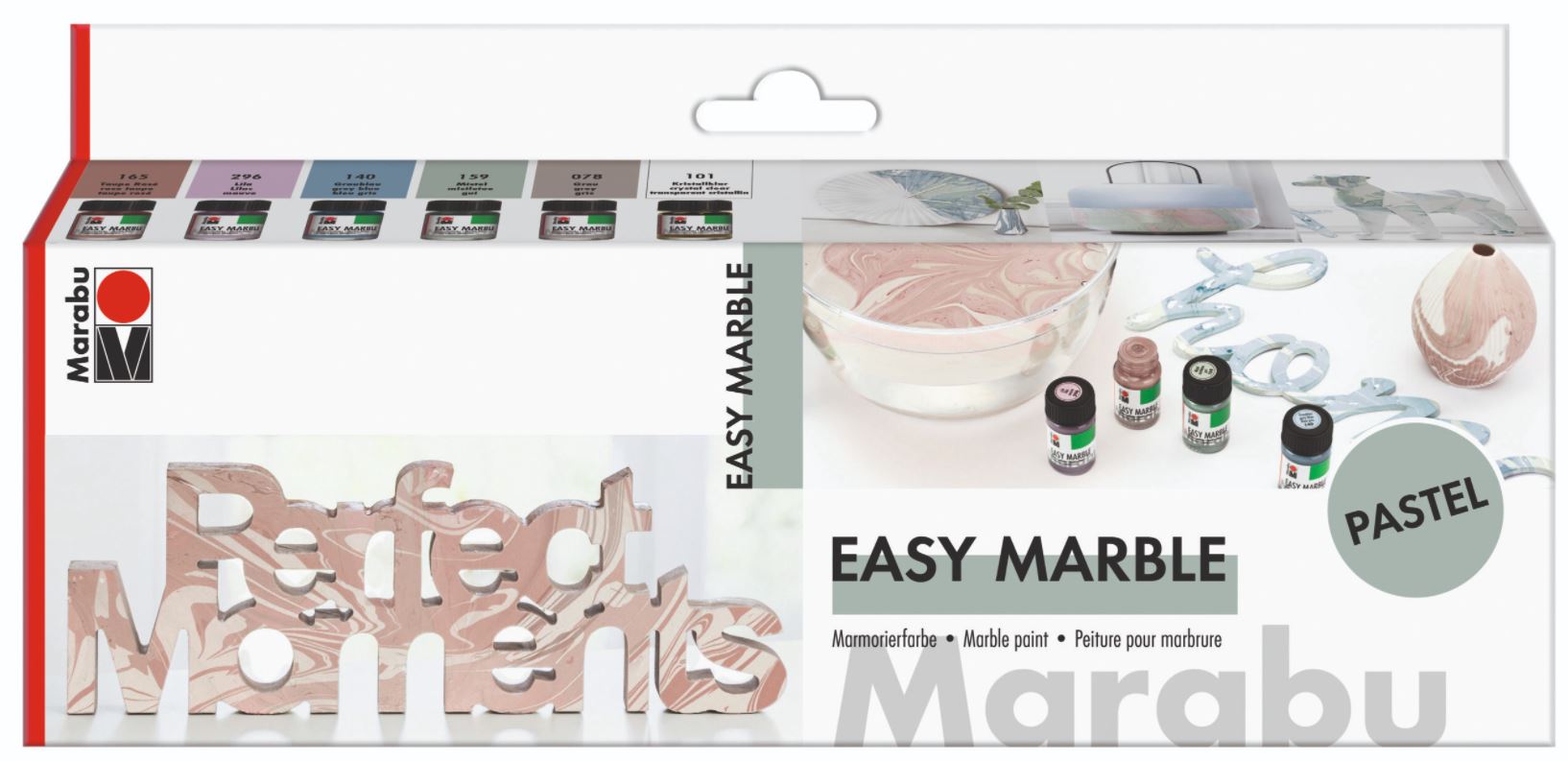 - Nopeasti kuivuva Easy Marble-marmorointivärisarja soveltuu etenkin kun dippaat marmoriväriin muovia, lasia, akryyliä, paperimassaa tai tyhjäksi puhallettuja munia.