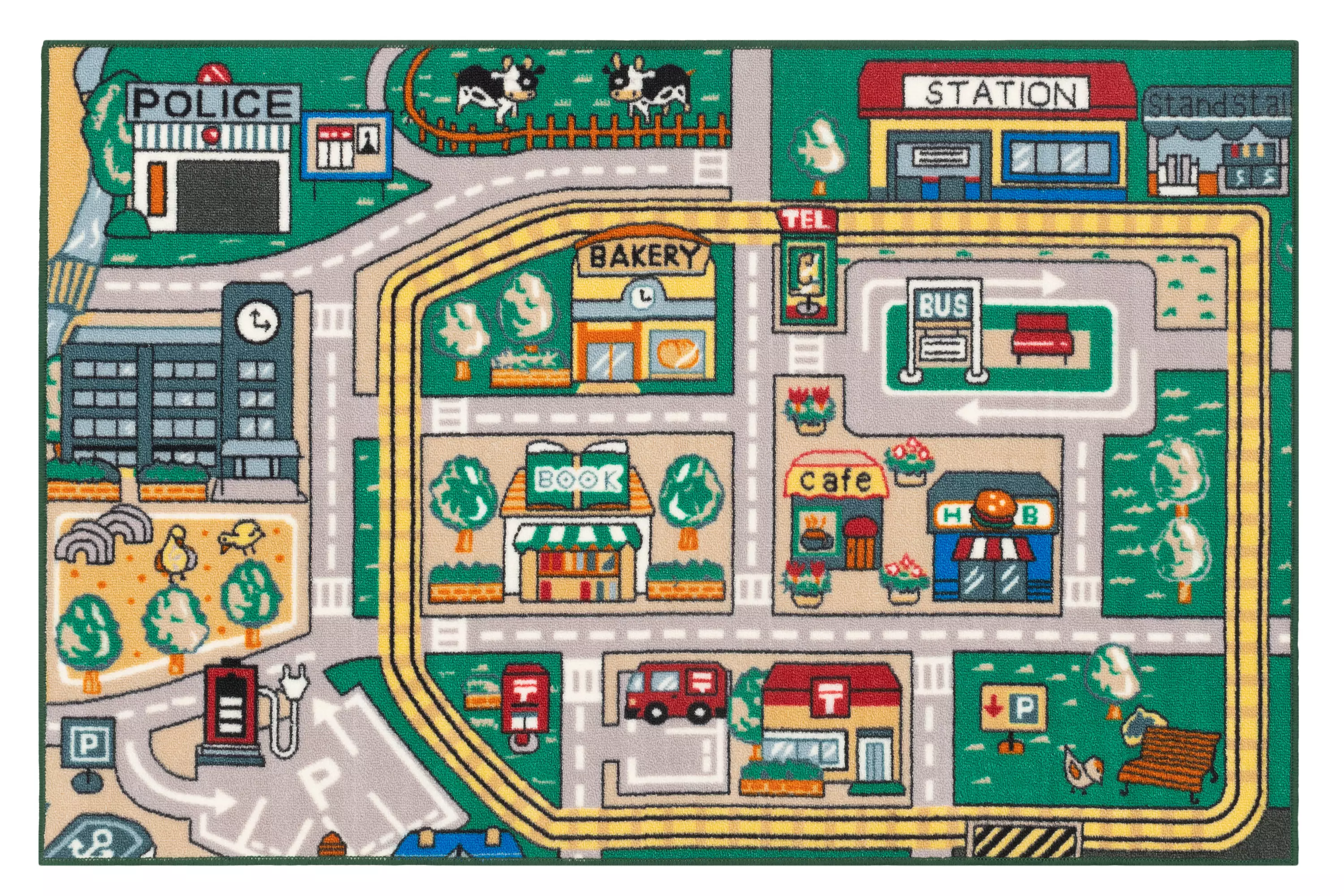 Helppohoitoinen bukleematto liukuestepohjalla. Maton kaupunkikuvio innostaa leikkeihin.