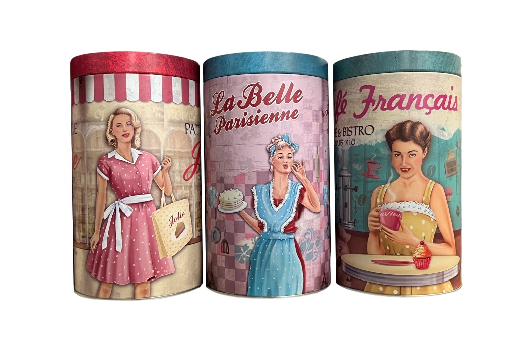Metallinen säilytyspurkki kuiville ruoka-aineille tai kodin pienille esineille.