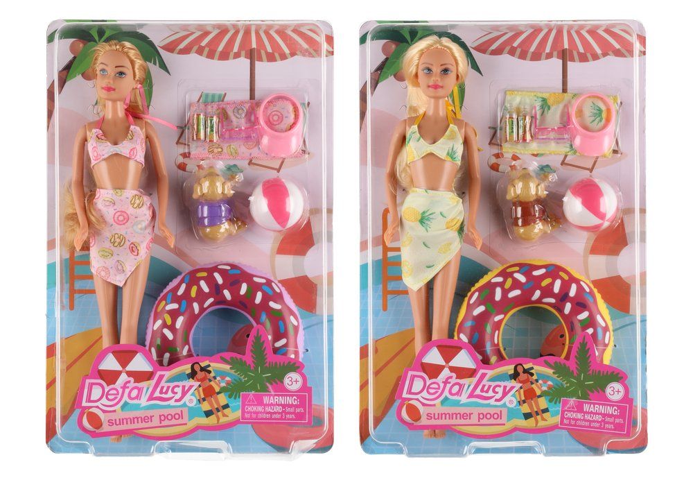 Setissä nukke uima-asussa, uimarengas ja tarvikkeita. Ikäsuositus 3+.
