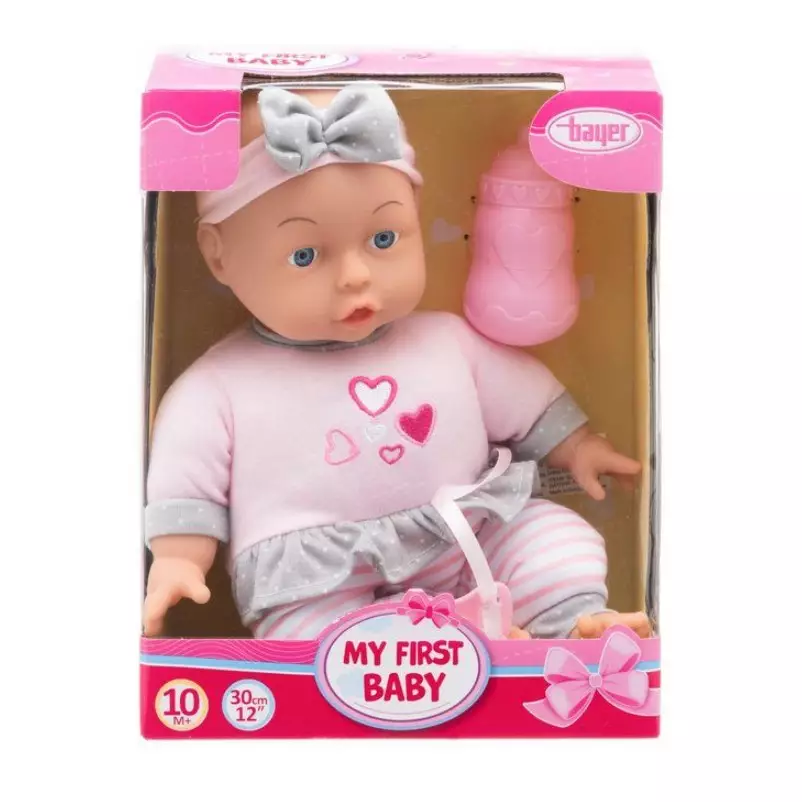 Nätti pehmeävartaloinen vauvanukke, jolla on päällään vaaleanpunainen pusero, raidalliset housut sekä rusettipääpanta. Nukella on mukanaan vaaleanpunaisen tutin ja tuttipullo.