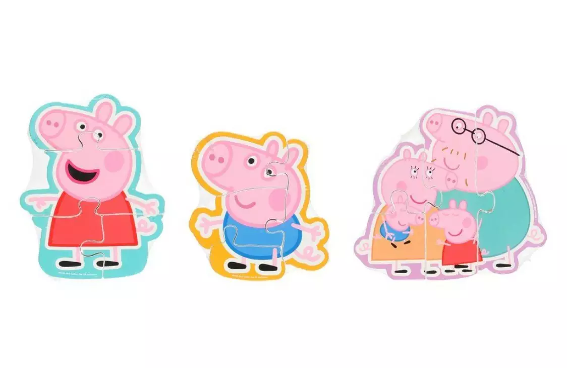 Suloinen puusta valmistettu Pipsa Possu-teemainen muotopalapeli. Kolme kuvavaihtoehtoa.