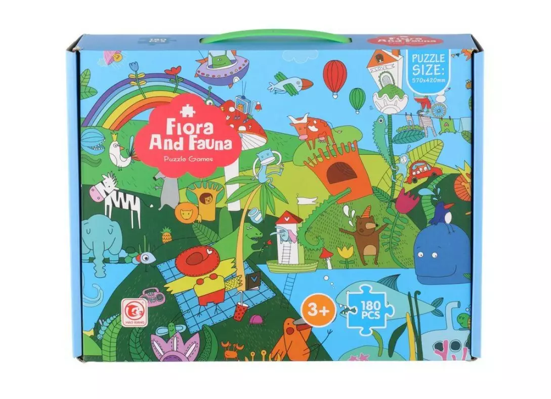 Värikäs palapeli, jonka kuvituksena on erilaisia eläimiä ja kukkia.
