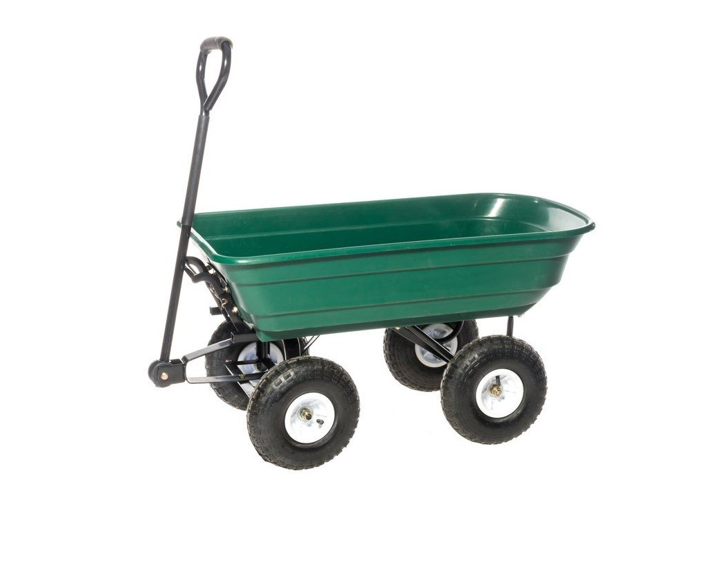 Kätevä vedettävä puutarhakärry 10" ilmakumipyörillä. Kevyt mutta kestävä polypropeenilava ja vahva teräsrunko.