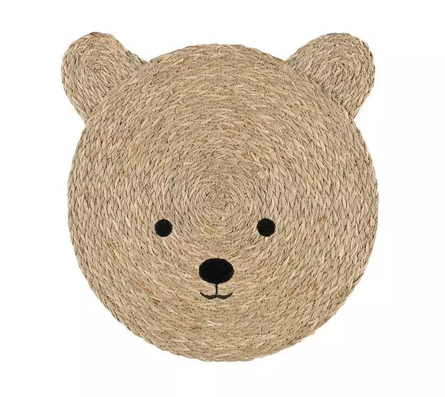 Meriheinästä punottu ruokapöydän tabletti, jossa leikkisä nallenpään muoto. Pyyhi tahrat kostealla liinalla.