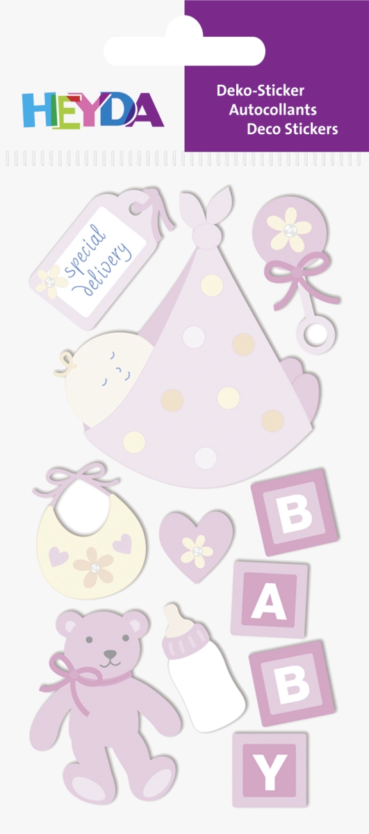 HEYDA Tarra-arkki Tyttövauva. Pahvipohjaiset tarrat sisältävät yksityiskohtaisia koristeita kuten helmiä, nauhoja ja akryylitimantteja.