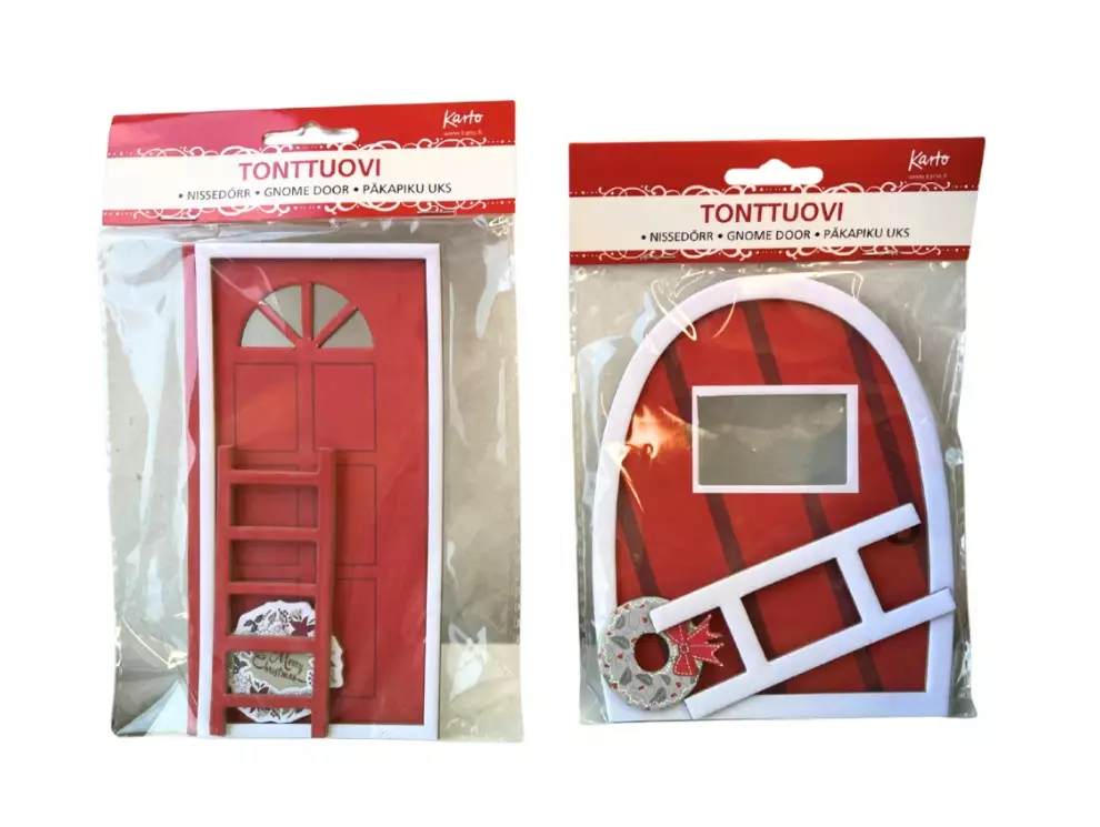 Kartonkinen tonttuovipakkaus, jossa irtonaiset kartonkiosat: ovi, ovenkarmit, tikkaat ja kranssi. Lisäksi pakkauksessa kiinnitystarrat osien kiinnittämiseen.