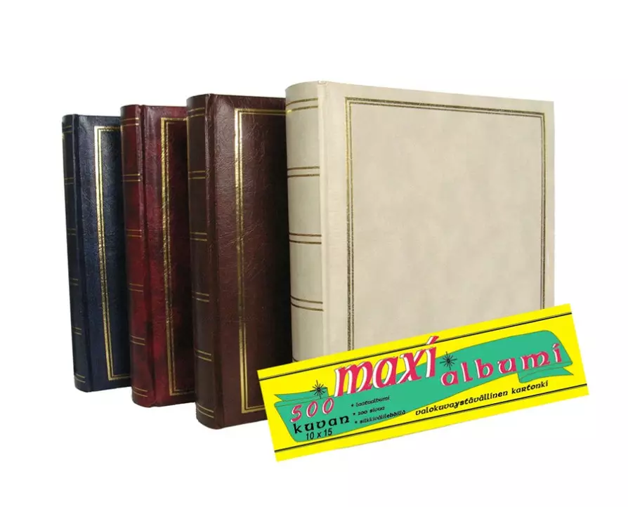 Laadukas kirjasidottu albumi kartonkisivuilla ja silkkivälilehdillä. Albumiin mahtuu 500 kpl 10 x 15 cm kokoista kuvaa. Valokuvat kiinnitetään liimaamalla.