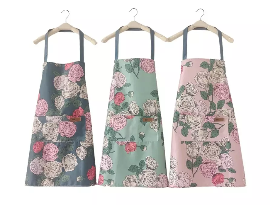 Ruusukuvioinen, vettä hylkivä esiliina. Esiliinassa kolme värivaihtoehtoa.