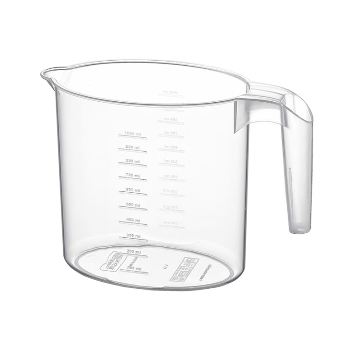 Kahvallinen litran vetoinen mittakannu/kaadin, jossa mitta-asteikko 100 ml:n välein.