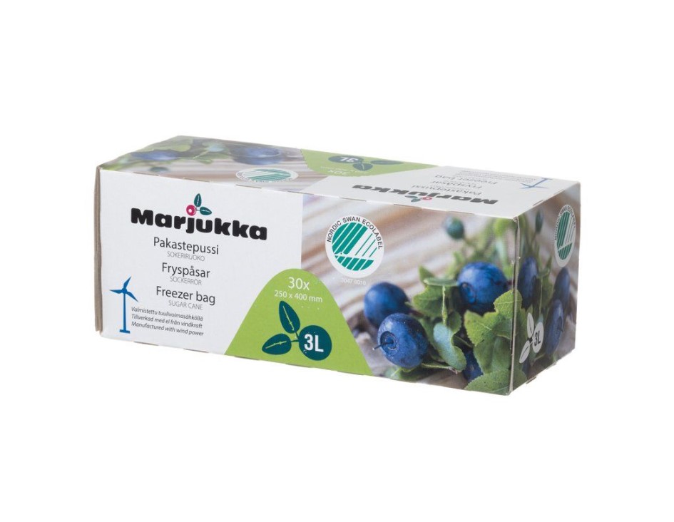 Marjukka Eko pakastepussien materiaali on valmistettu uusiutuvasta sokeriruokoetanolista. Pakastepussit kierrätetään normaalin muovijätteen tapaan.