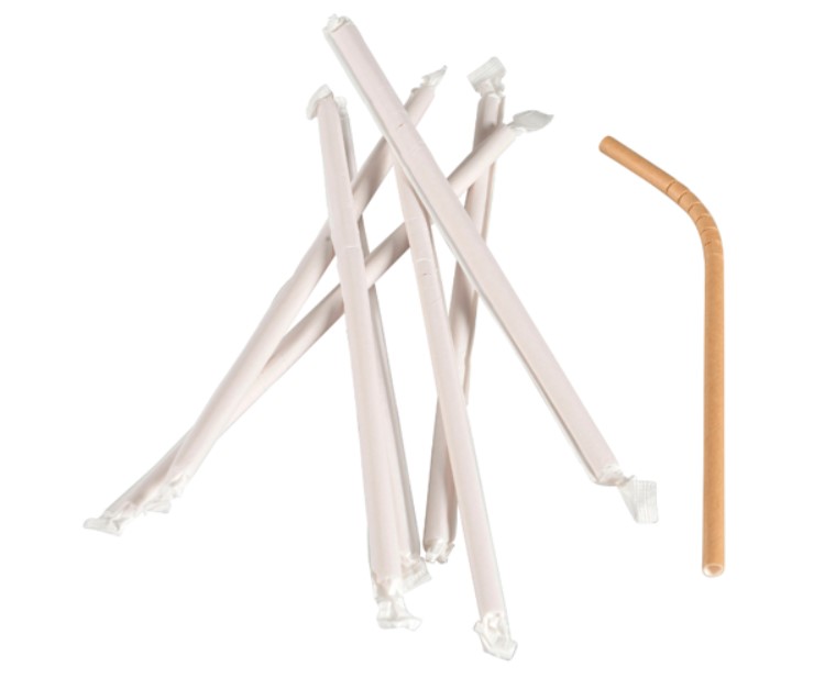 Taivutettu yksittäispakattu ruskea paperipilli.