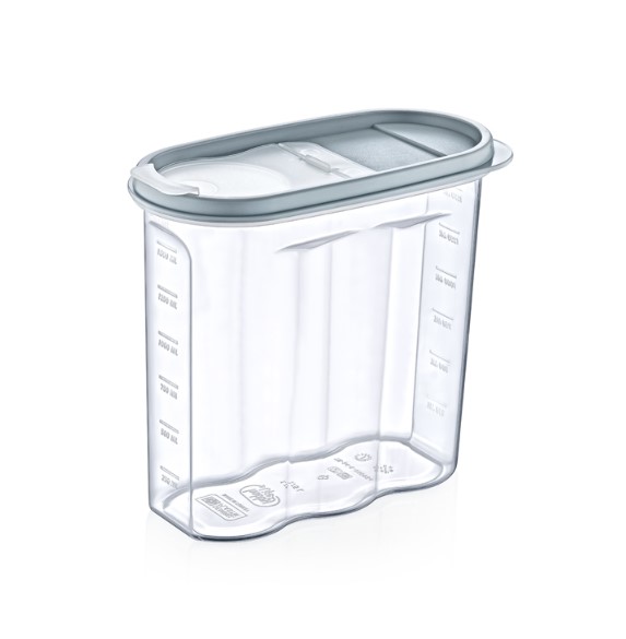 Korkea ja kannellinen säilytysastia sopii keittiön kuivaelintarvikkeille, kuten muroille, myslille, pavuille ja linsseille. Säilytysasiassa ml-mitta-asteikko 250 ml:n jaolla. Astian kannessa kätevä annosteluaukko.