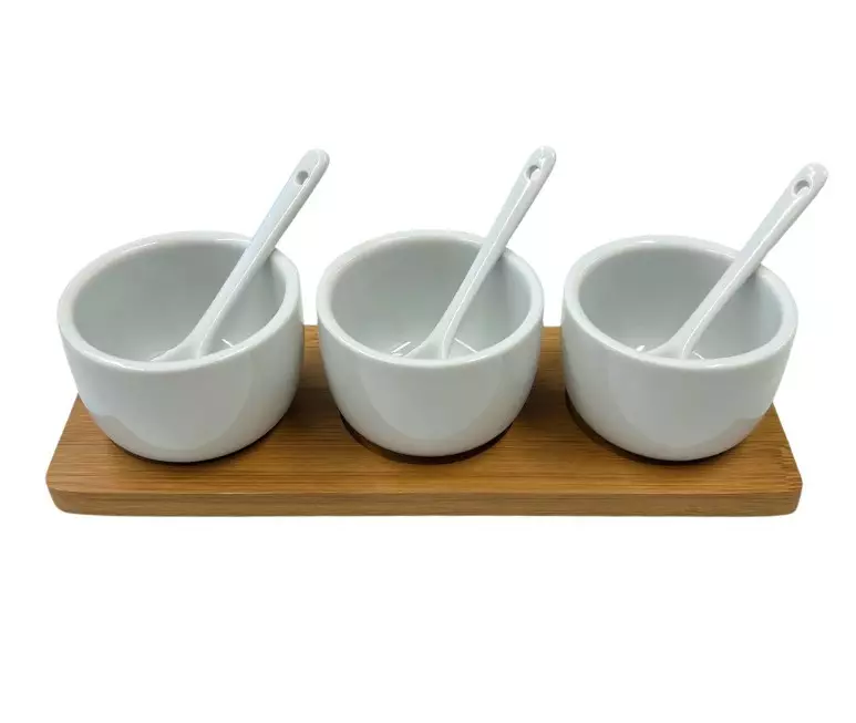 Tarjoilusetissa kolme posliinista kastike-/alkupalakulhoa, kolme posliinista lusikkaa sekä bambuinen alusta.