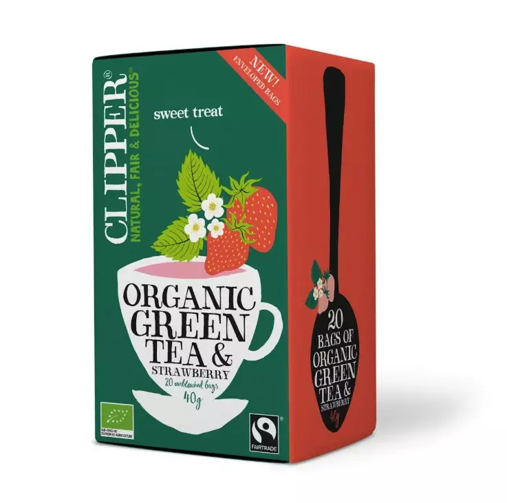Clipper Organic Green Tea & Strawberry on sekoitus Reilun kaupan sertifioitua ja luomulaatuista puhdasta vihreää teetä maustettuna mansikalla. Nauti kupillinen marjaisan mansikkaista vihreää teetä kun kaipaat pientä virkistystä tai rentouttavaa hetkeä työpäivän aikana.