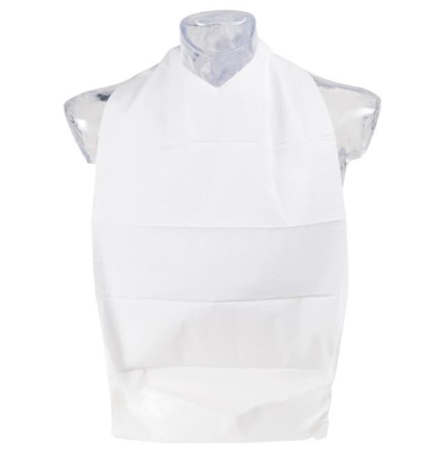 Kertakäyttöinen aikuisten ruokalappu, jossa solmittavat nauhat ja käännettävä tasku.