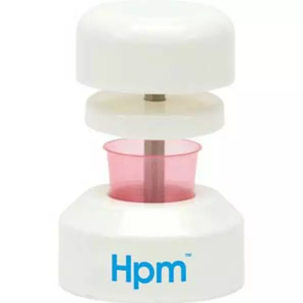 HPM tabletinmurskain, joka murskaa tabletin suoraan lääkelasiin. Käytetään tabletin murskaamiseen lääkelasissa. Sopii kapeille lääkelaseille.