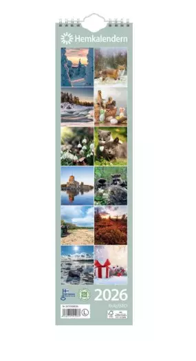 Koko 110 x 432 mm; parikierresidottu; kielisyys: suomi, ruotsi; teemakuva jokaiselle kuukaudelle; toinen puoli suomen- ja toinen ruotsinkielinen; nimi- ja juhlapäivät; Avainlippu-tuote; FSC®-sertifioitu tuote; 100 % hiilineutraali tuote.