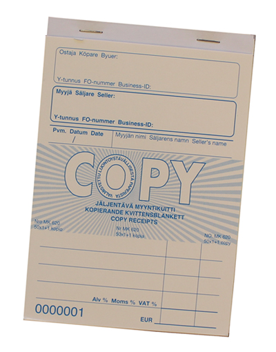 Myyntikuitti A6 1 + 1 kopiota. Perferoitu. Yhteenveto takakannessa. 50 + 50 lehteä. Numerointi. suomi/ruotsi/englanti.
