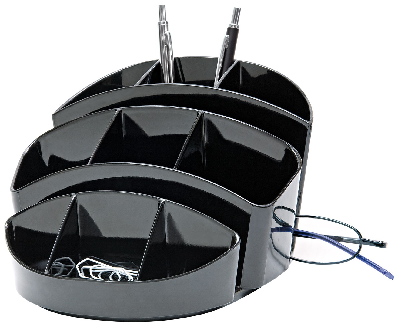 Pöytäjärjestelijä Rotondo. Valmistettu polystyreenistä. 9 osastoa, tilaa kirjeelle ja muistikirjalle. Liukumisen estävän muovin vuoksi teline ei riko pintaa. Mitat: 15x13,5x9 cm Hakusanat: kynäpurkki, kynäteline, kynäkuppi, kynälokerikko