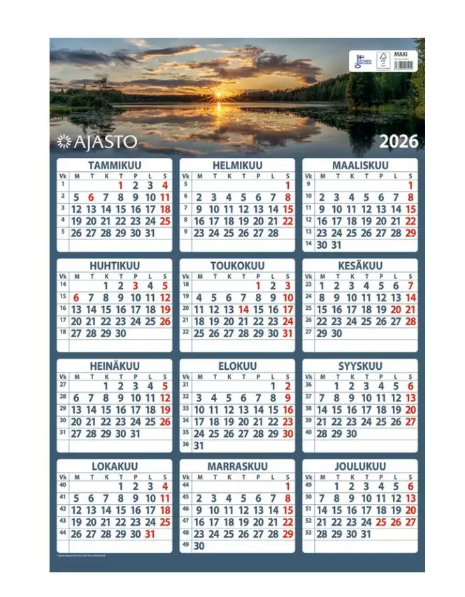 Koko 520 x 740 mm; kielisyys: suomi, ruotsi; seinällä pidettävä selkeä vuositaulukko; monipuolinen käyttömahdollisuus; kääntöpuolella sekä suomen- että ruotsinkieliset pienennetyt kalenterit; Avainlippu-tuote; FSC®-sertifioitu tuote.