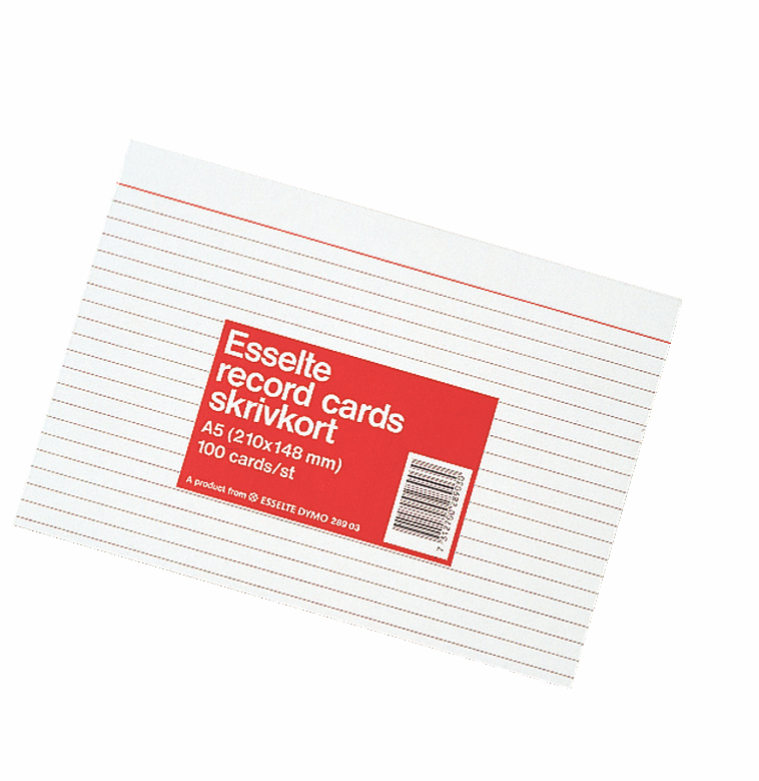 Kortistokortti kortistolaatikkoon. Molemminpuolin valkoinen pohja viivoilla. 100kpl/pkt Ilman reikiä Koko: A6L Malli 170 gsm